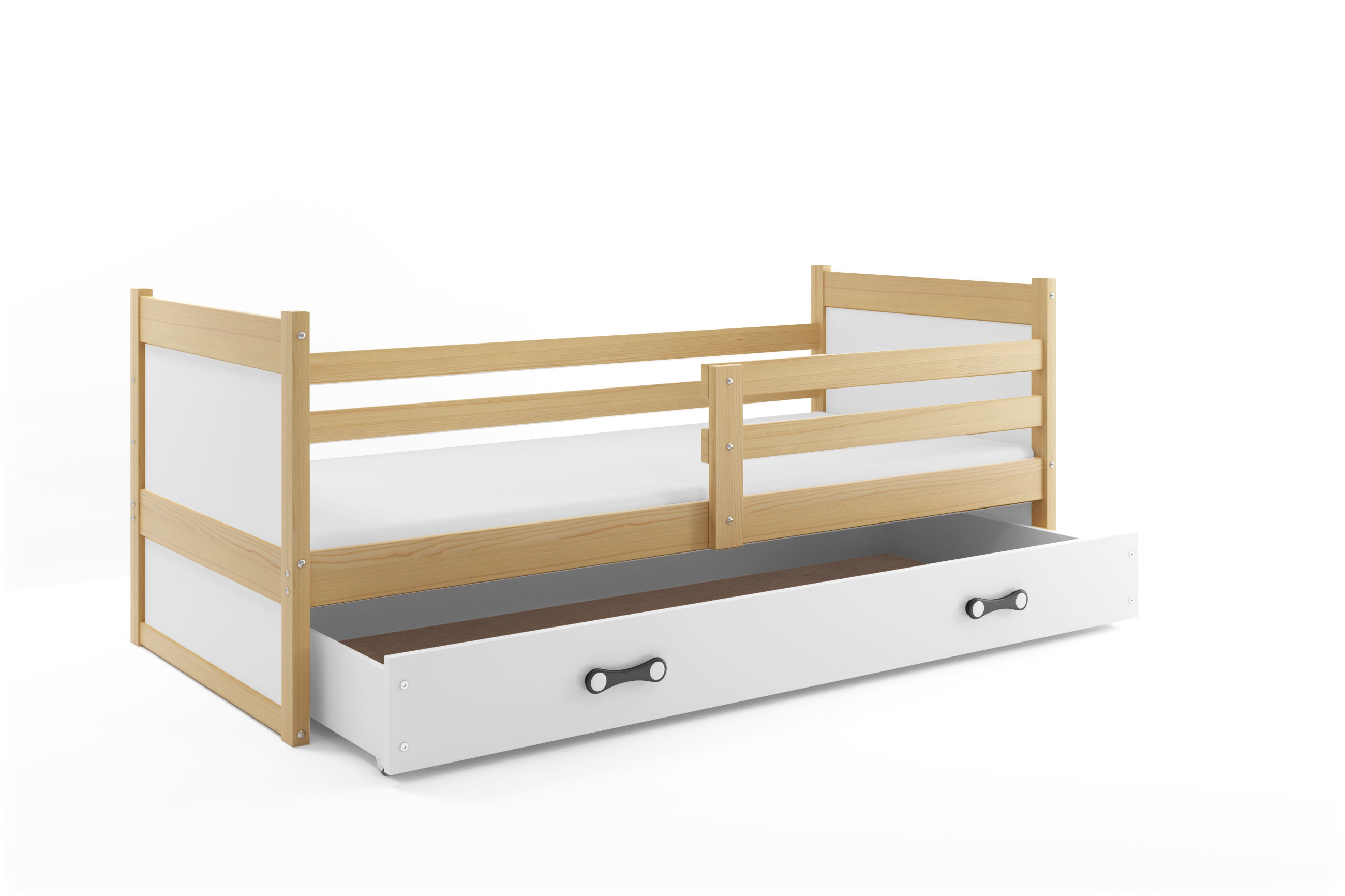 Posteľ RICO 1 190×90 je bezpečné a praktické jednolôžko pre deti a mládež. Spája masívny nelakovaný borovicový rám a biele MDF výplne, ktoré dodávajú izbe moderný a čistý vzhľad. Borovicové drevo je pevné, stabilné, zdravotne nezávadné a každému kusu dodáva originálnu kresbu. Biele MDF prvky sú upravené ekologickým vodným lakom vhodným aj pre citlivé deti.